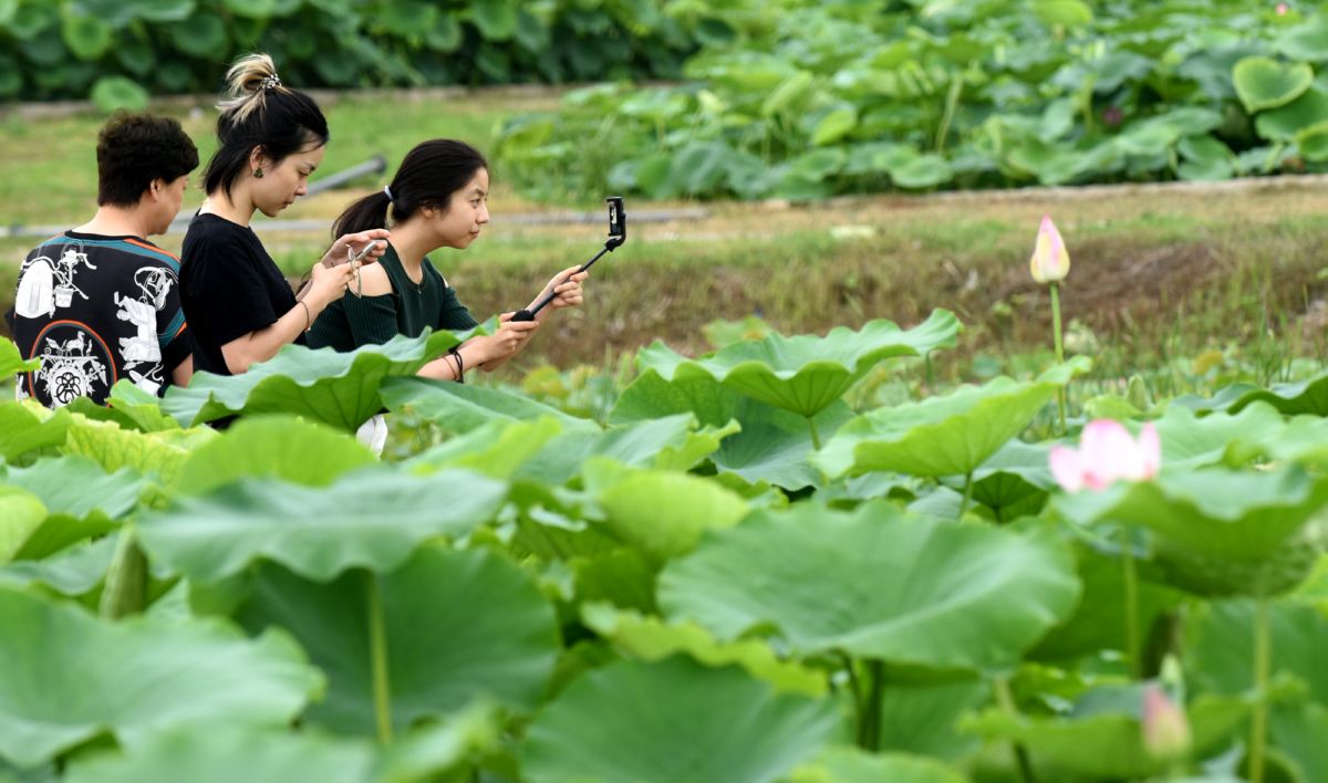 7月12日,游人在垣曲县古城国家级湿地公园赏花拍照。