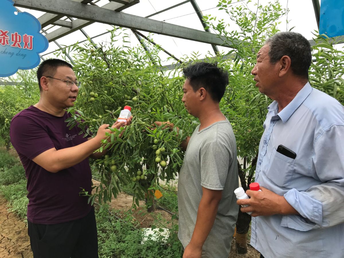 本报讯 7月12日,临猗县庙上乡西北庄村村民李屯的大棚冬枣园里,农技服务师冯玉麟向村民讲解生物增色保鲜剂的使用方法(上图)。