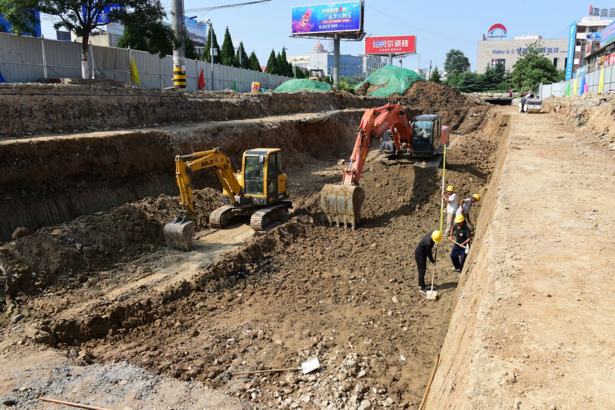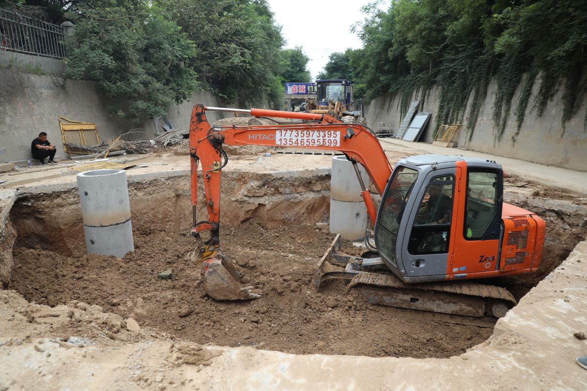 近日,工人在运城经开区安中路地下排水改造工程施工现场紧张施工。该工程北起机场大道,南至禹都大道,按照雨污分流方式设计,主要解决安邑北街雨污合流的突出问题,缓解机场大道、禹都市场的排水压力。 记者 姚普超 摄