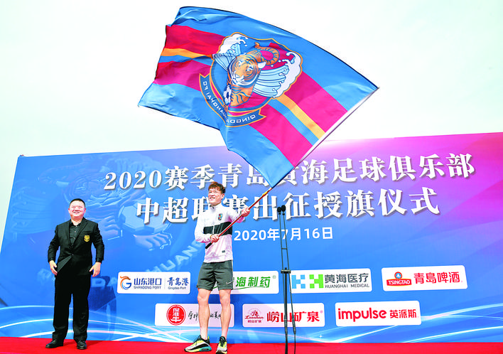 ▶7月16日,青岛黄海青港队队长王栋(右)在出征仪式上挥舞队旗。 当日,青岛黄海青港队举行中超联赛出征授旗仪式并展示2020赛季球队主场队服。青岛黄海青港队于2019赛季夺得中甲联赛冠军升入中超,将在7月25日中超联赛第一阶段苏州赛区的第一场比赛中对阵武汉卓尔队。