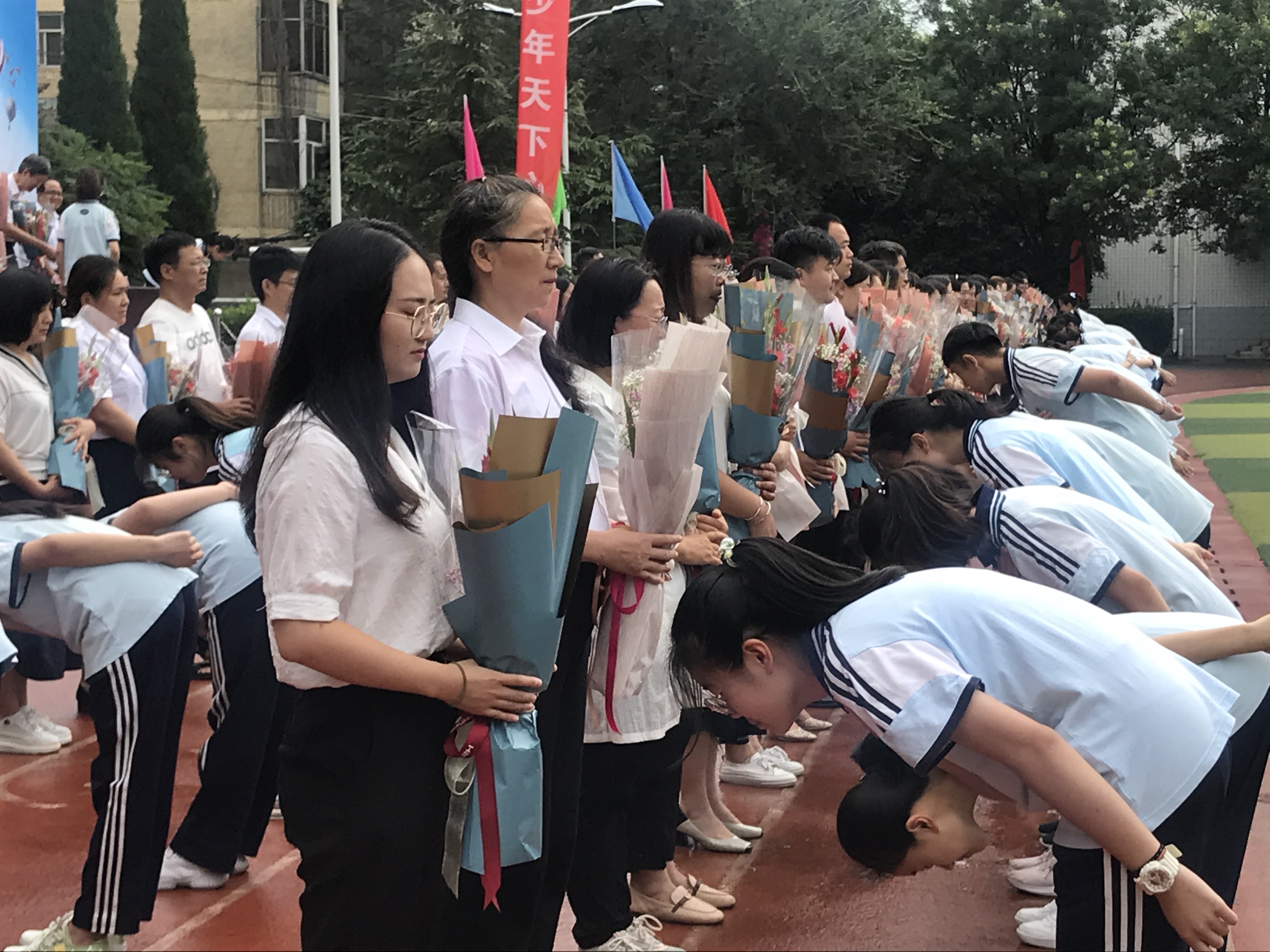 升旗仪式后,4名学生代表上台发言,对3年来母校的培育与教导表示感谢,并承诺在以后的日子里会奋发图强,不辜负学校对他们的期望。随后,学生们为全体初三教师送上鲜花,并深深鞠躬。