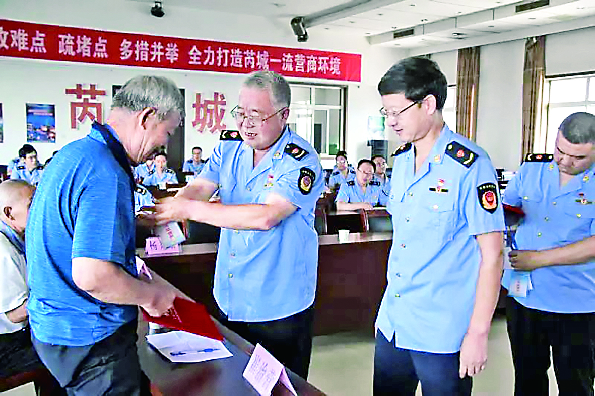 ▲7月16日,芮城县市场监督管理局举行优化营商环境义务监督员聘任仪式,现场为11名义务监督员颁发聘书。