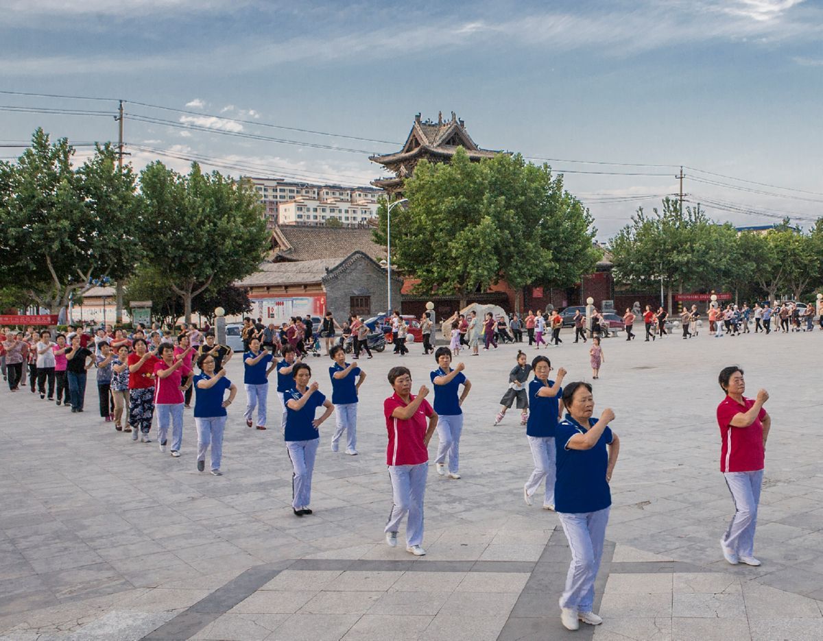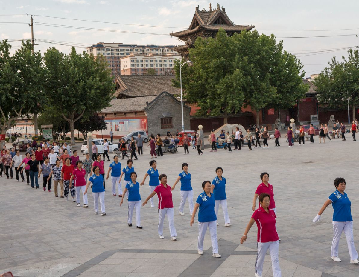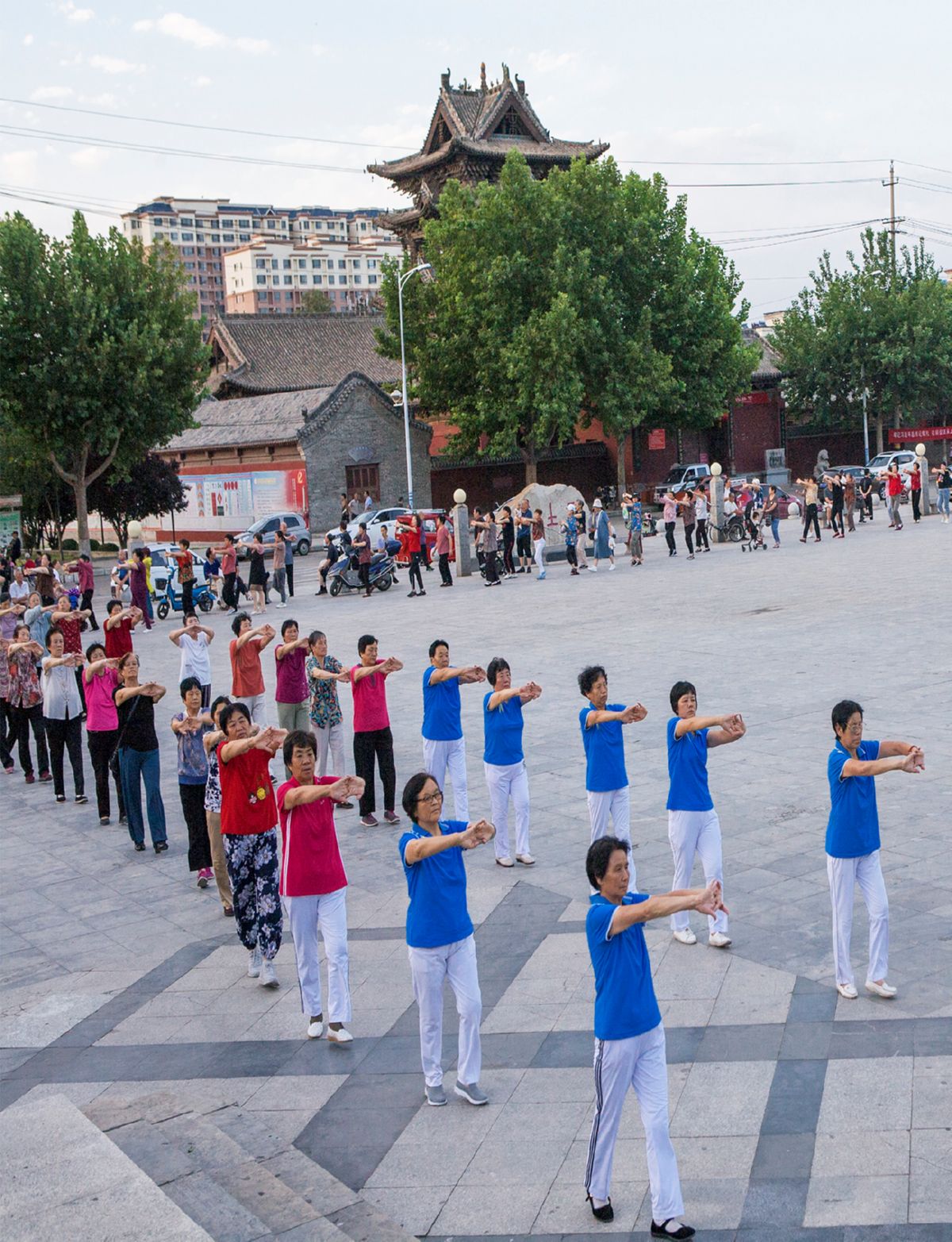 在万荣县飞云楼下的后土文化广场,一支200多人的消夏健身队伍格外抢眼。