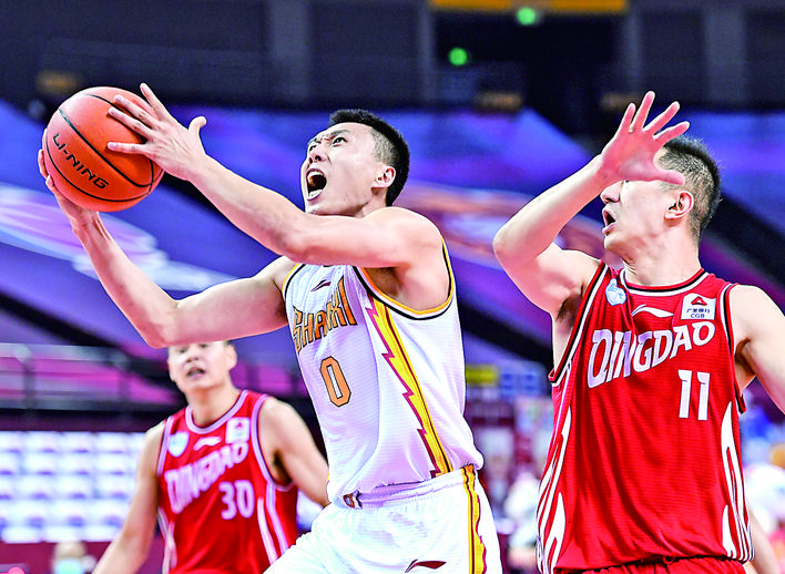 ▶7月20日,山西汾酒股份队球员田桂森(左)在比赛中突破上篮。 当日,在山东青岛举行的2019~2020赛季中国男子篮球职业联赛(CBA)复赛第二阶段(红岛赛区)比赛中,山西汾酒股份队以90比79战胜青岛国信双星队。 新华社记者 朱峥 摄