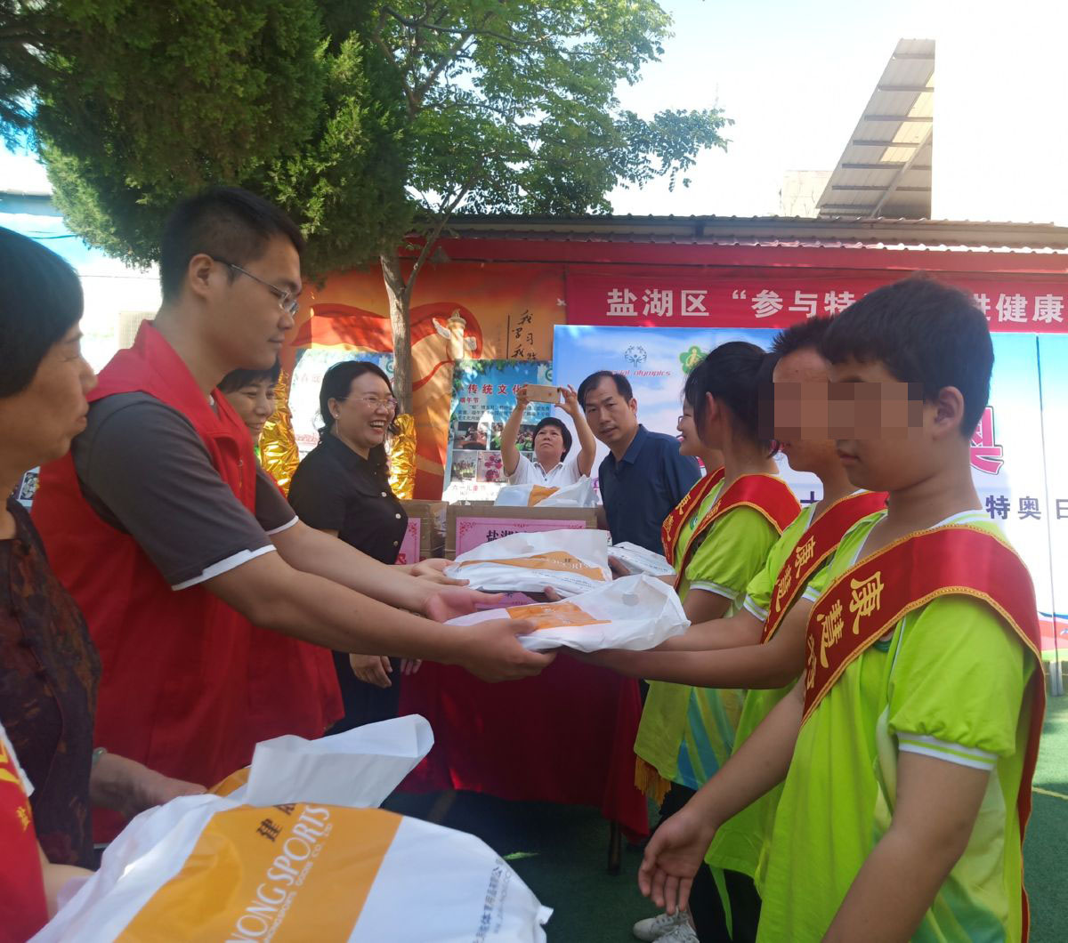 ▲盐阿湖区残联工作人员为学子们发放运动服 陶登肖 摄