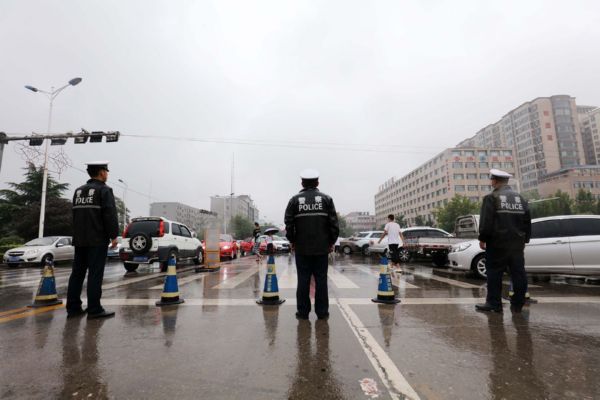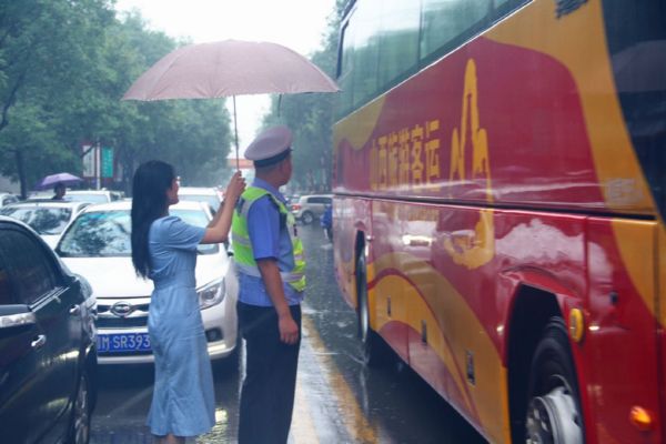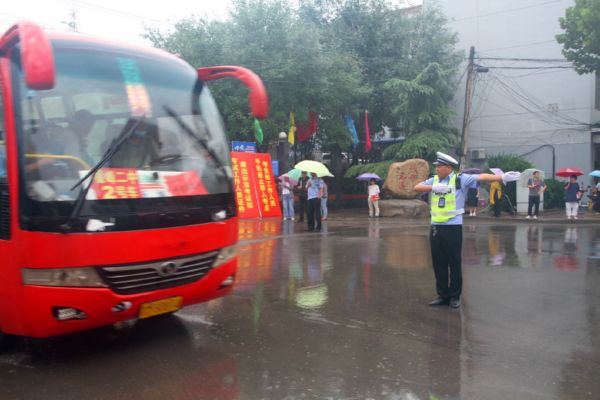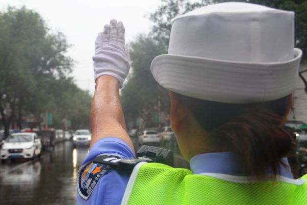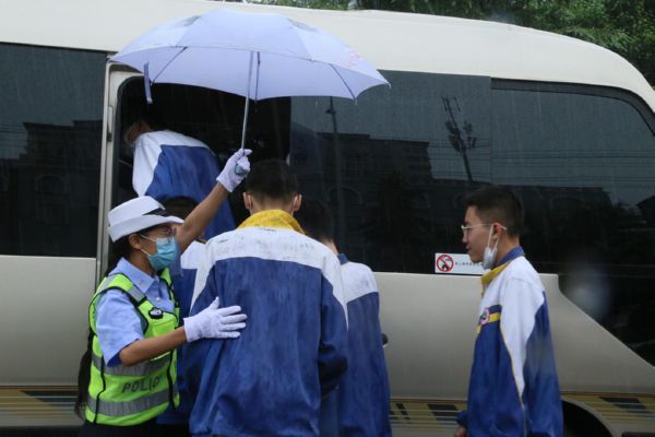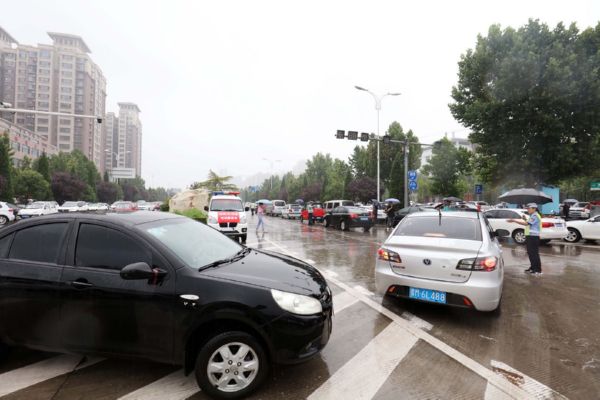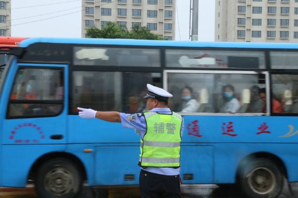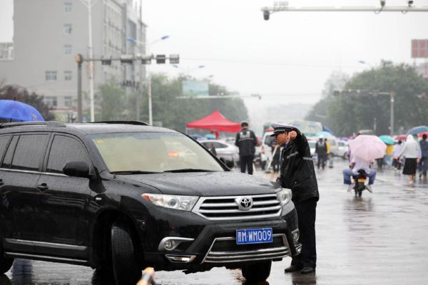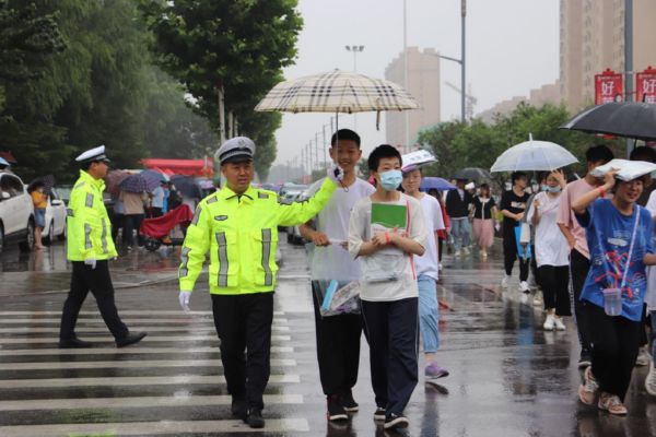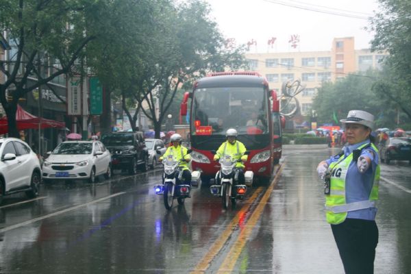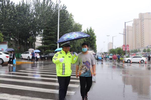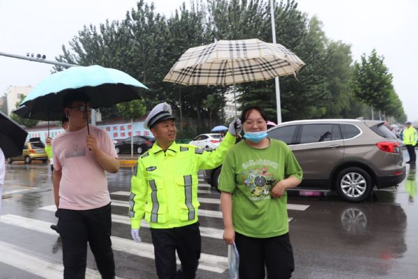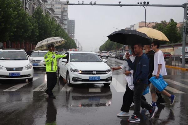当日,我市普遍出现降雨天气。为确保雨天道路通行安全、畅通、有序,保障广大中考学子按时参考,运城交警坚守雨中,全力护航中考期间道路交通安全。 贺海萍 摄