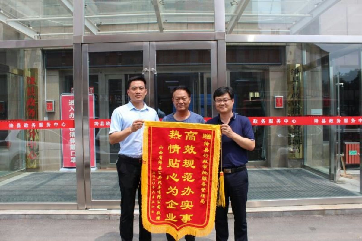 运城晚报讯 近日,绛县公共汽车有限公司负责人,将一面写有“高效规范办实事、热情贴心为企业”的锦旗,送到了绛县行政审批服务管理局工作人员手中(下图)。