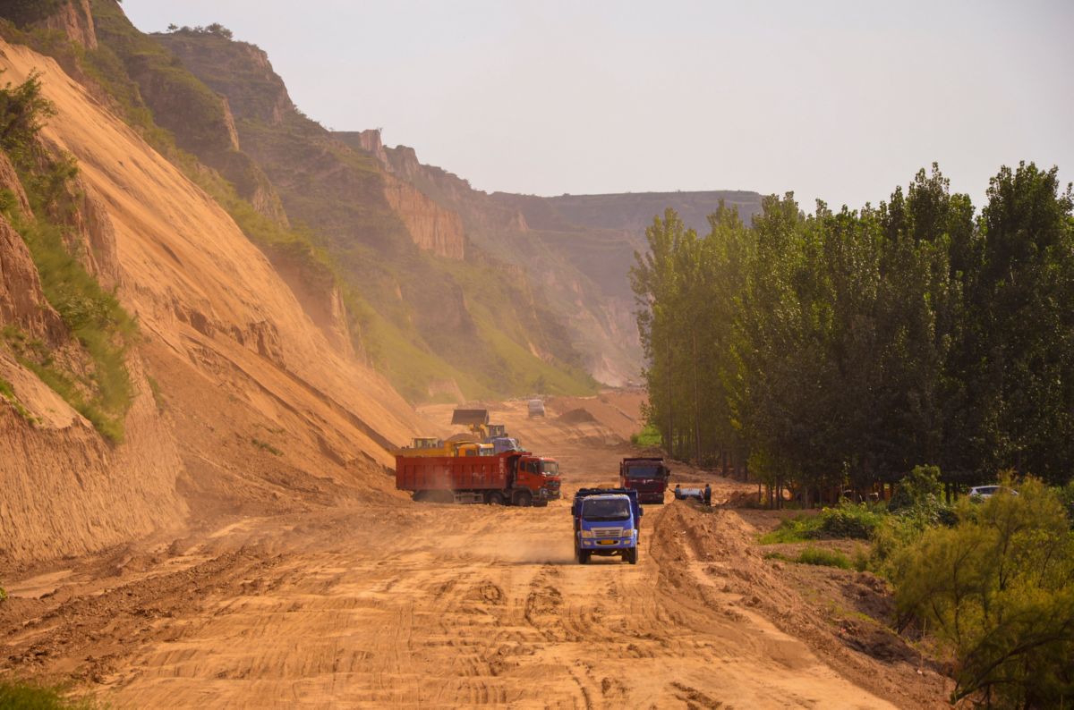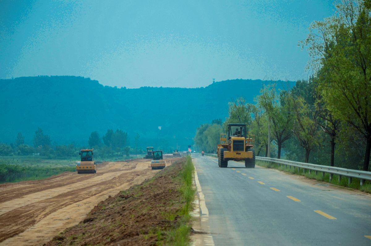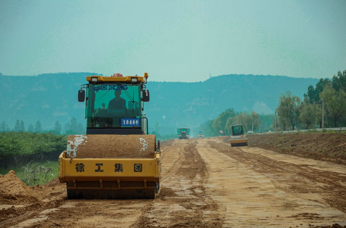 ▲7月20日,施工人员在万荣县裴庄镇孙石村滩涂地,进行路基扩建的土方压实作业。