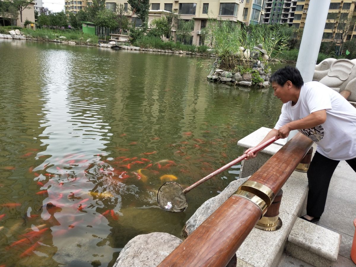 清洁工打捞人工湖里的纸团 崔萌 摄