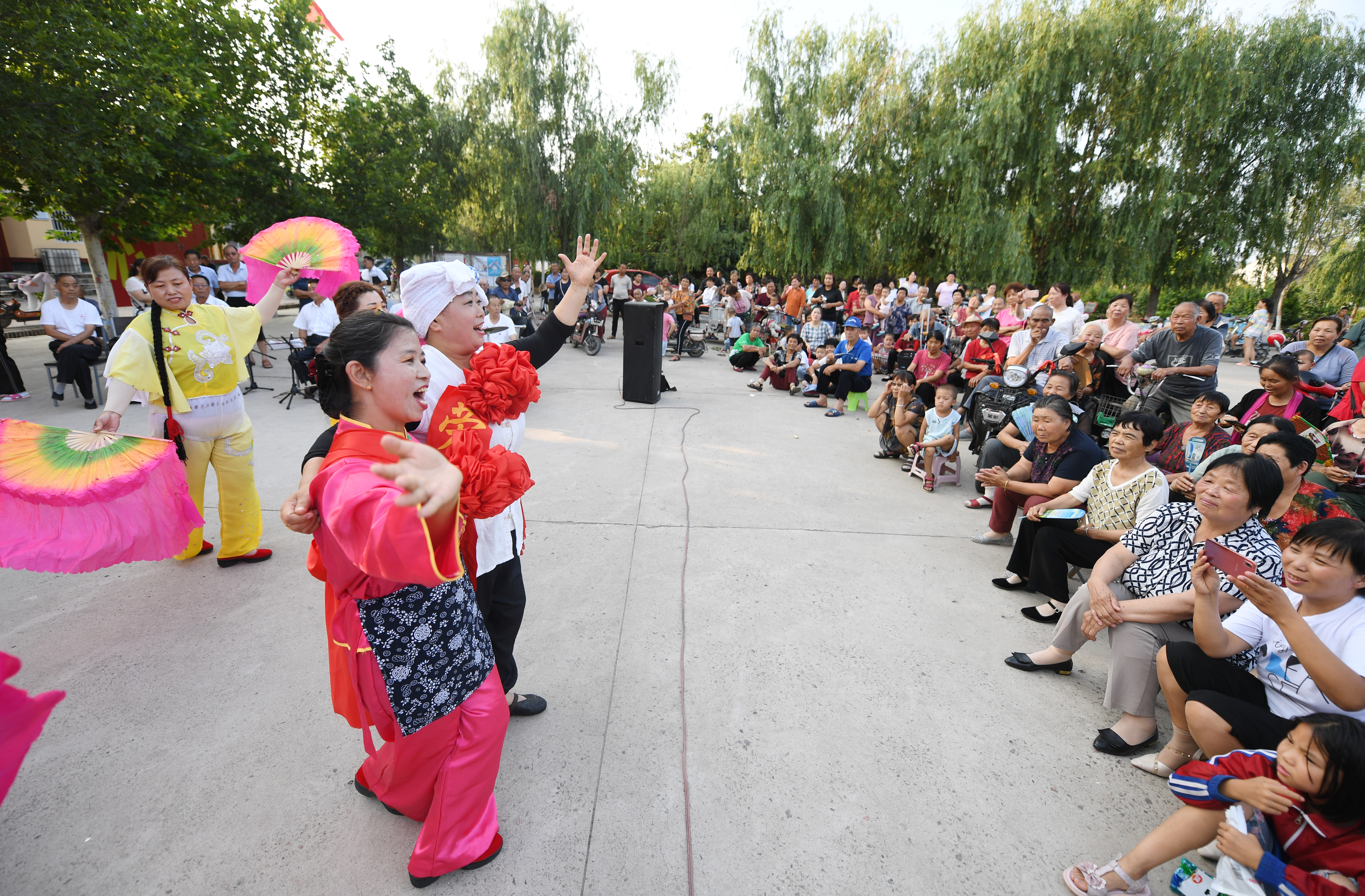 7月22日,演员们在永济市城北街道西伍姓村表演节目。 为了深入贯彻落实习近平新时代中国特色社会主义思想,扎实推进新时代文明实践工作,打通宣传群众、教育群众的“最后一公里”,永济城北街道近期在辖区各社区、农村展开新时代文明实践进社区进农村——“感党恩 跟党走”文艺巡演。巡演以歌舞、说唱、戏曲等群众喜闻乐见的形式,结合“三零”单位创建等工作,将一系列主题突出、内容丰富的文艺节目送到群众家门口。 特约摄影 李向东 摄