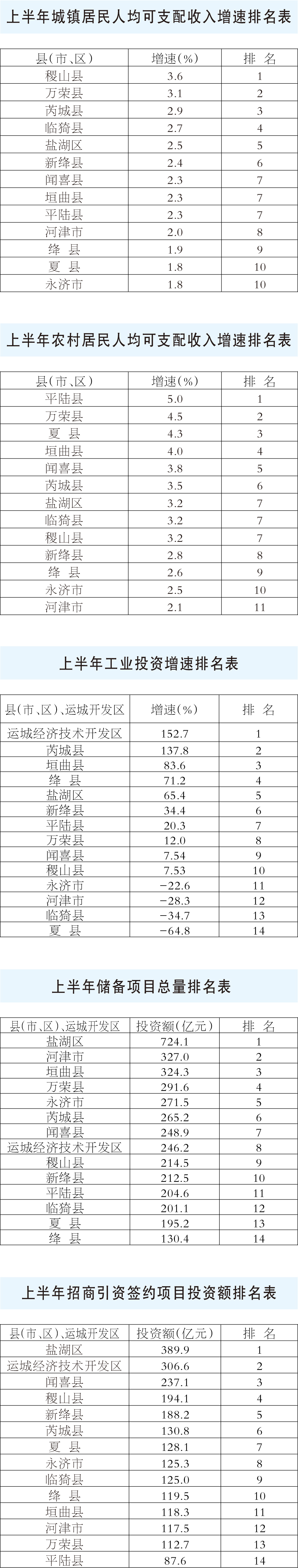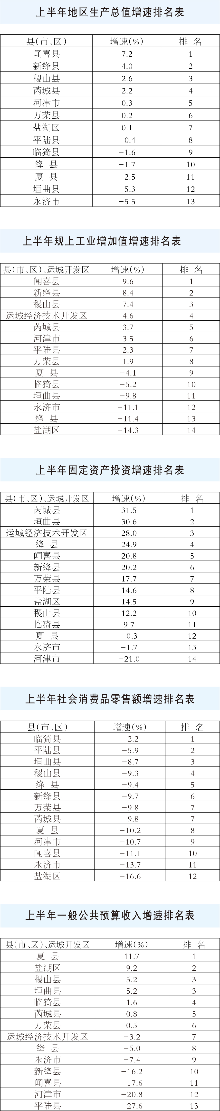 为进一步鼓励先进强化激励,现将各县(市、区)上半年主要经济指标、转型项目建设主要工作目标增速和排名公布如下。