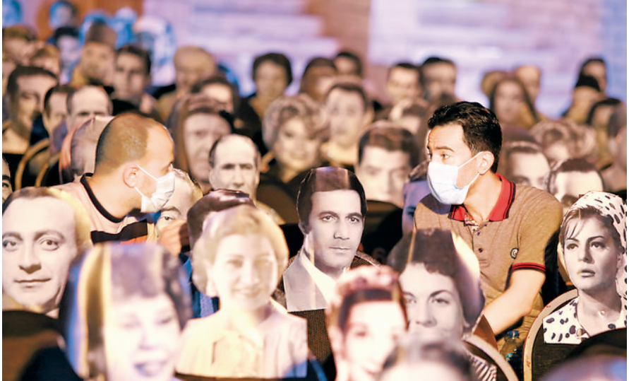▲7月25日,在埃及首都开罗的一家剧院,人们坐在名人照片之间交谈。 埃及开罗的一家剧院在座椅上摆放了埃及早期歌星和影星的照片,帮助人们在观看演出时保持社交距离。埃及卫生部25日晚说,埃及境内新增新冠确诊病例511例,累计确诊91583例。 新华社发