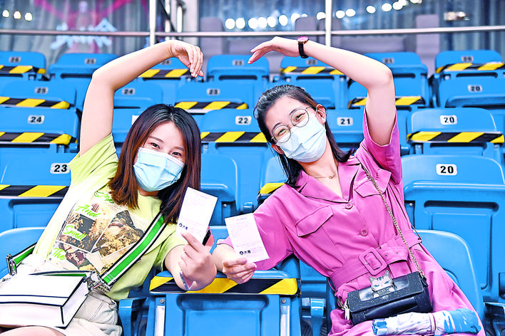 ▲7月26日,在青岛国信体育馆,两位现场观看比赛的观众展示着自己的纸质球票。 当日,在山东青岛举行的2019~2020赛季中国男子篮球职业联赛(CBA)复赛第二阶段(崂山赛区)比赛中,医护人员、教师、公安战线人士通过官方购票平台,完成包括核酸检测在内的相关流程后进场观看了上海久事队迎战山东西王队的比赛。 观赛期间,观赛者须全程佩戴口罩,对号入座,严格保持间隔一米就座。退场时,观众须按照自后向前、先两边后中间的顺序,保持“一米线”社交距离有序退场。