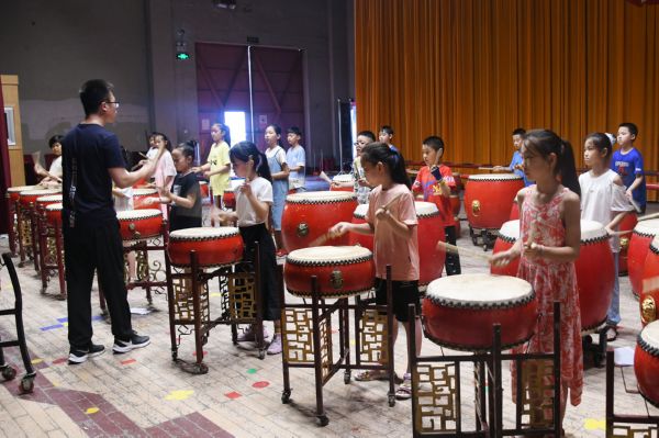7月27日,闻喜县东街实验小学学生在县文化馆老师指导下排练鼓乐《秦王点兵》。