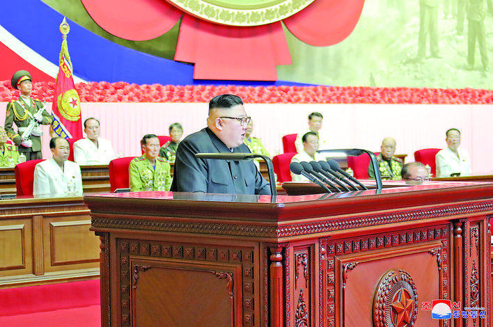 ▲7月27日,朝鲜最高领导人金正恩在平壤举行的朝鲜第6次全国参战老兵大会上致辞。 据朝中社28日报道,朝鲜第6次全国参战老兵大会27日在平壤举行。朝鲜最高领导人金正恩在致辞中向老兵及中国人民志愿军烈士等致以崇高敬意。新华社/朝中社