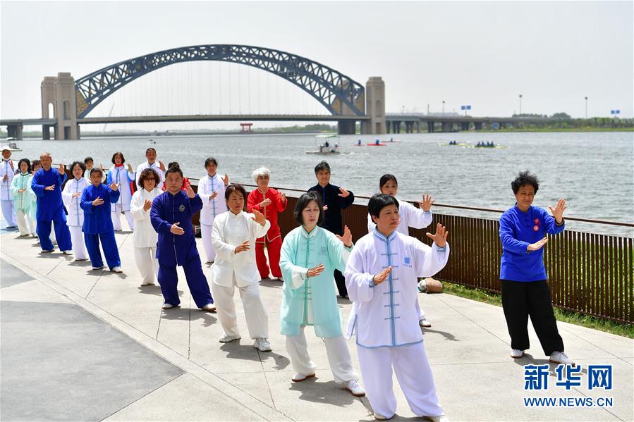 太原市民在汾河太原城区晋阳桥段附近锻炼身体(5月12日摄)。 新华社记者 曹阳 摄