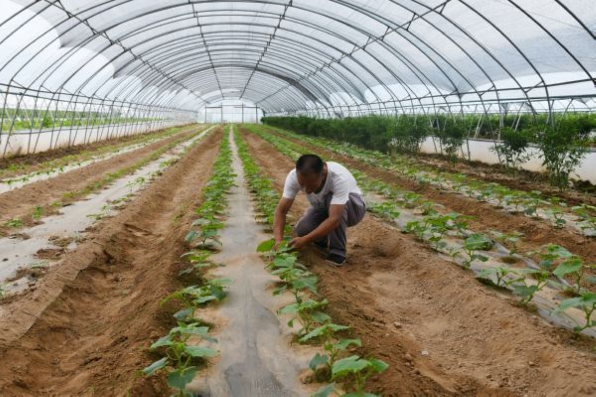7月26日,闻喜县裴社乡大泽村村民在“扶贫大棚”里务弄黄瓜苗。