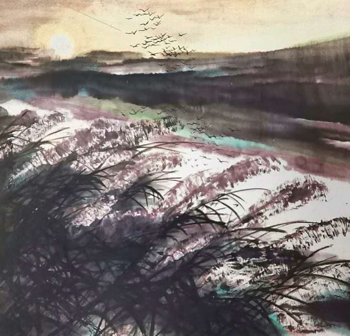 唐朝的山水田园诗人王维,苏轼评他的诗是“诗中有画,画中有诗”。读他的诗,可谓诗情画意,如他的《辋川集》,简直就是一本画册。我想他是把自然界的美景先捕入眼帘,在心里绘成图,再写进诗里的吧?我们现在读他的诗,就是再把它还原成大自然中的山水实景。而周泽闻显然受王维影响巨大,一些画作就是直接以诗题入画的,如《西塞鹭飞》《风雨欲来》《海上生明月》《会当凌绝顶》《出山泉亦清》等,都有着唐诗的影子。