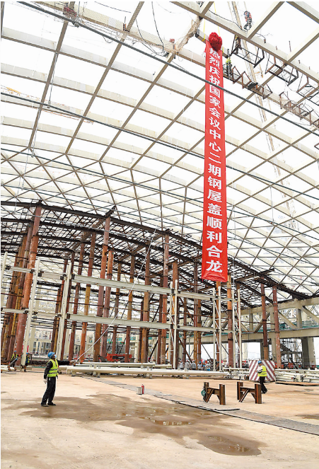 据施工单位北京建工集团相关负责人介绍,钢结构屋盖滑移施工可有效减少国家会议中心二期主体工程高空作业量。在钢结构施工中,项目团队运用三维激光扫描、BIM建模等前沿技术不断优化方案,实现节材近5000吨并有效缩短工期,拼装、焊缝等施工工序均要求高于国家标准。