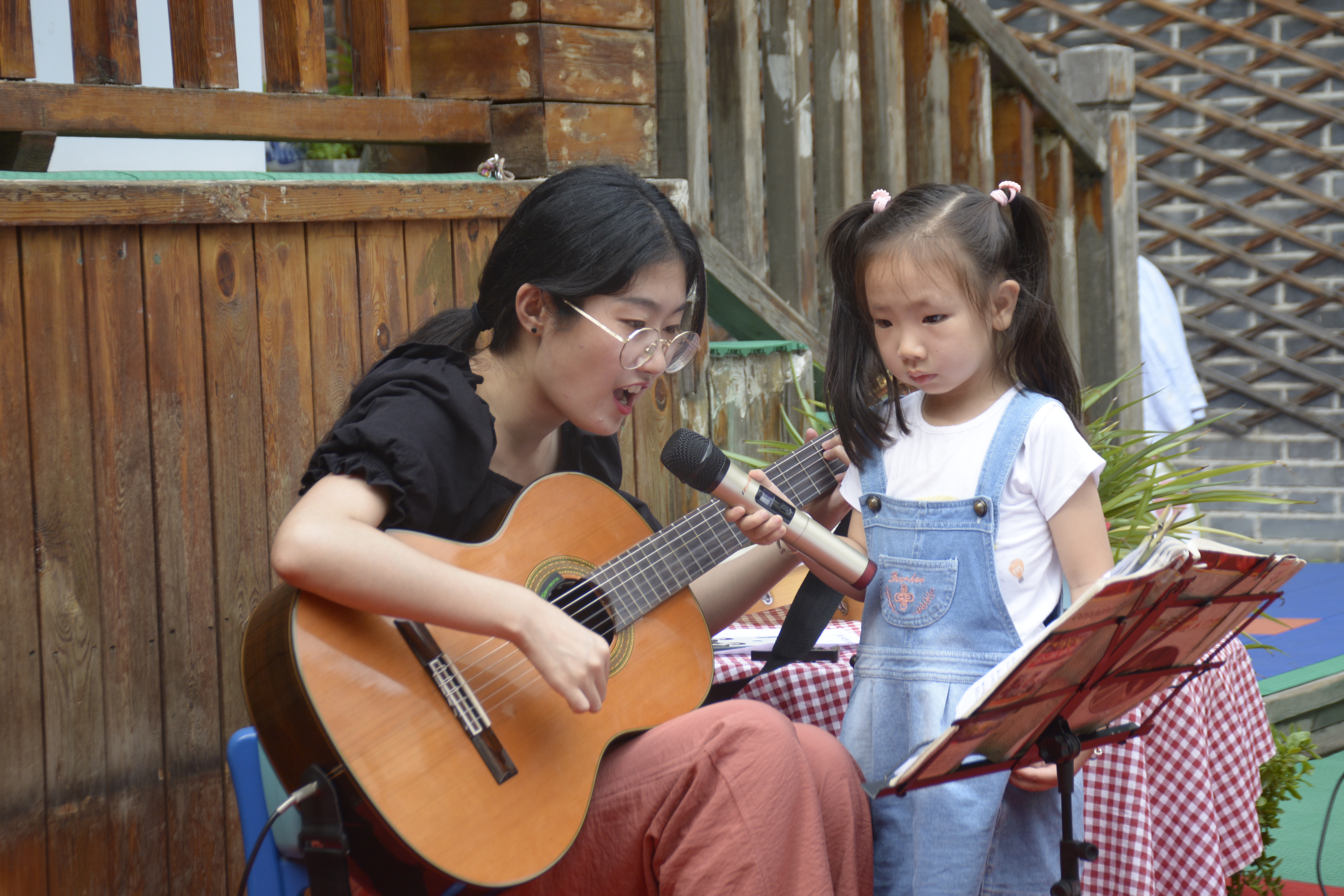 “小朋友们,吉他有几根弦啊?”“吉他的声音都一样吗?”活动中,田丹蕾老师首先讲解了吉他的一些基本知识,然后弹起吉他,和小朋友们一起演唱了《小星星》《少年》等歌曲。