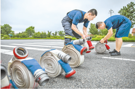 ▶7月31日,在山东荣成沽河河畔一处训练场,消防员在捆盘消防水带。 为进一步加强消防员的消防救援能力,积极做好夏季训练工作,山东荣成消防救援大队近日组织开展消防夏训科目训练,旨在提高消防员的协同配合能力,增强业务水平。 新华社发