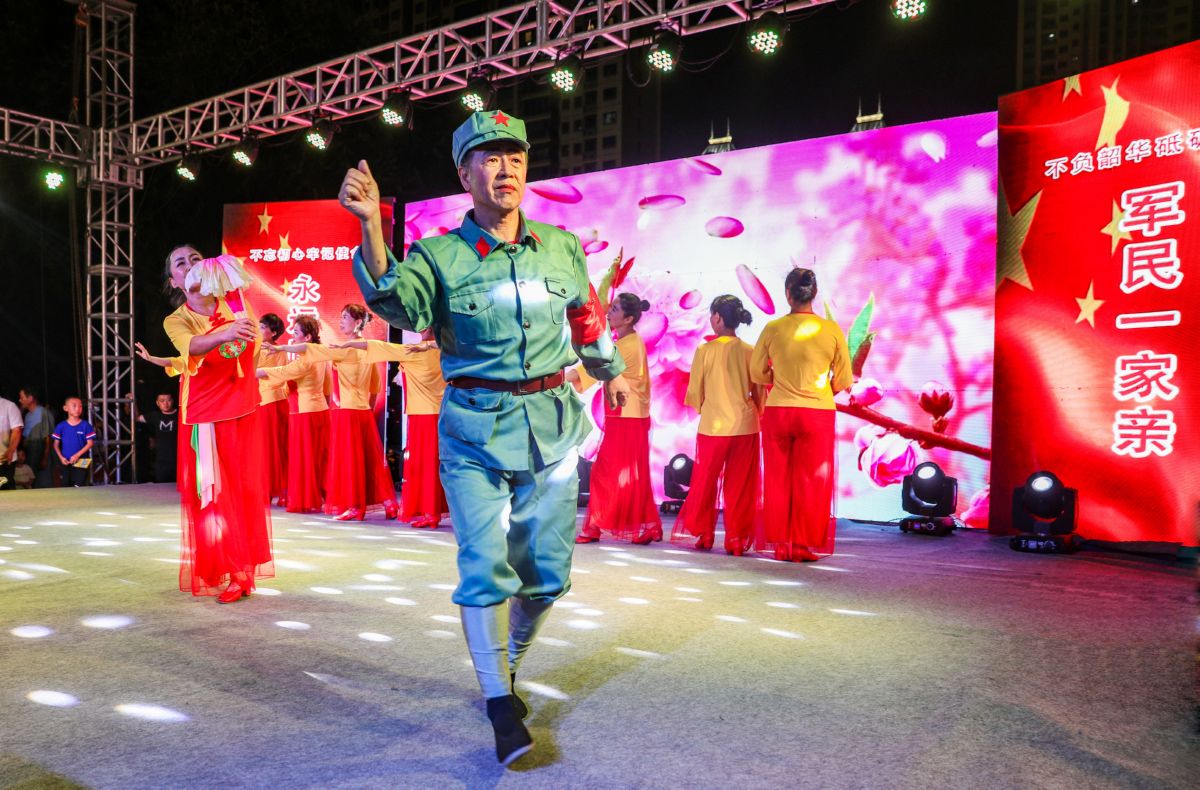 7月30日,盐湖区恒大绿洲社区舞蹈队在表演舞蹈《映山红》,为社区军属、退役军人献上节日问候。 记者 金玉敏 摄
