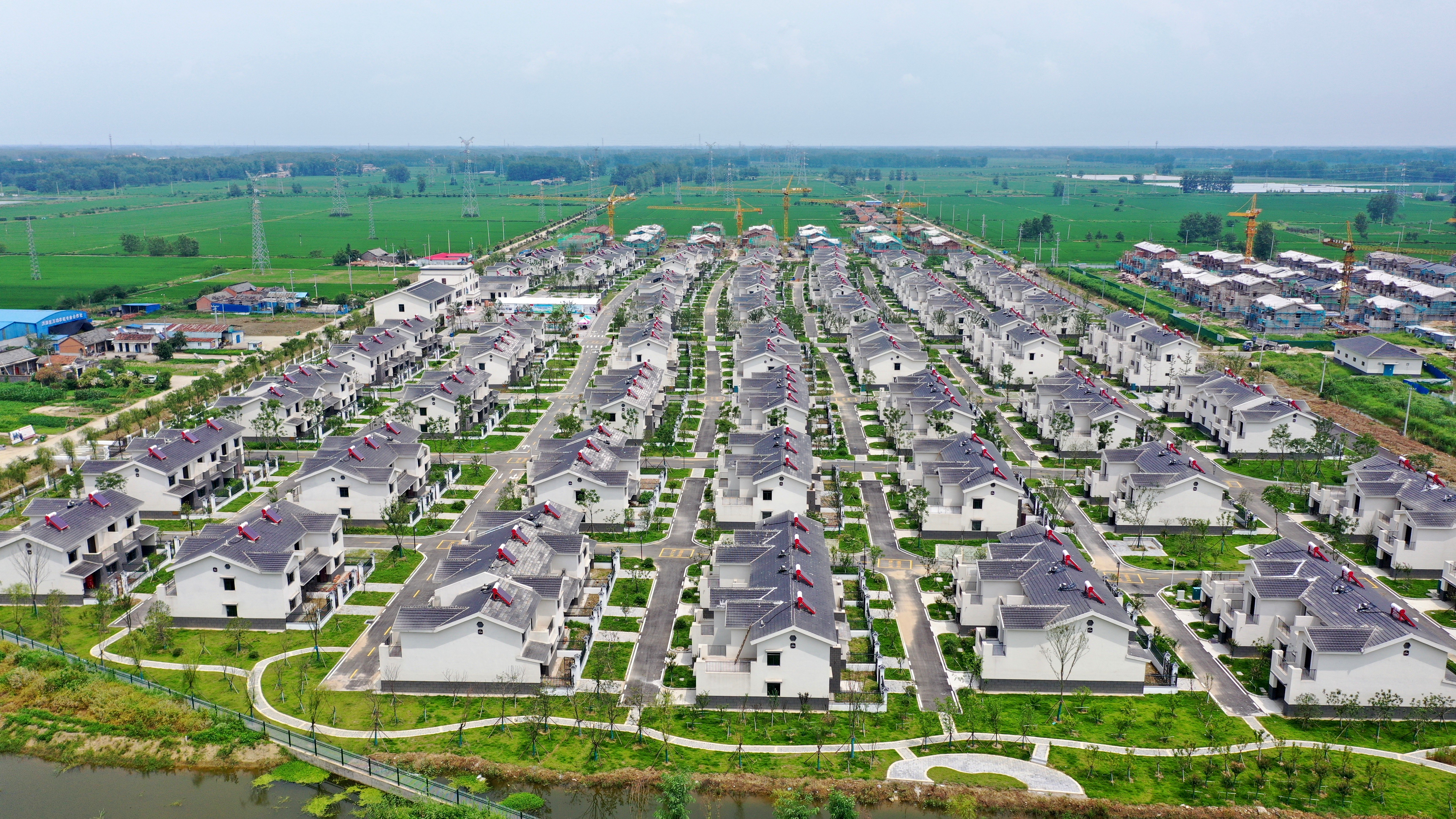 这是8月2日在淮安市洪泽区朱坝街道曹庄村拍摄的农民住房条件改善项目“田园雅居”(无人机照片)。 当日,江苏省淮安市洪泽区朱坝街道曹庄村农民住房条件改善项目“田园雅居”一期191套房屋正式交付,当地农民喜获新房。近年来,淮安市洪泽区大力推进农房改善工作,一处处美观整洁的新房出现在农村的田野上,极大地改善了当地百姓的住房条件。 新华社发(陈 凯 摄)