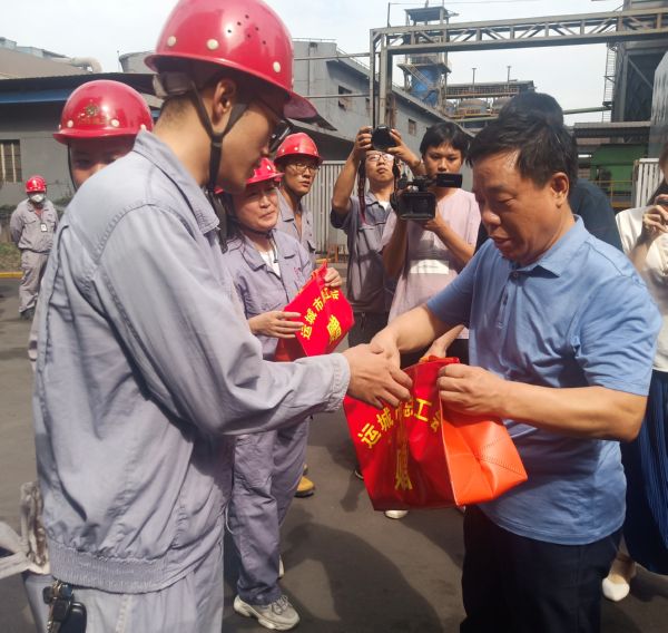市总工会党组书记李志民(右)为山西建龙实业有限公司炼铁1号高炉作业区职工代表发放防暑降温物品 陶登肖 摄