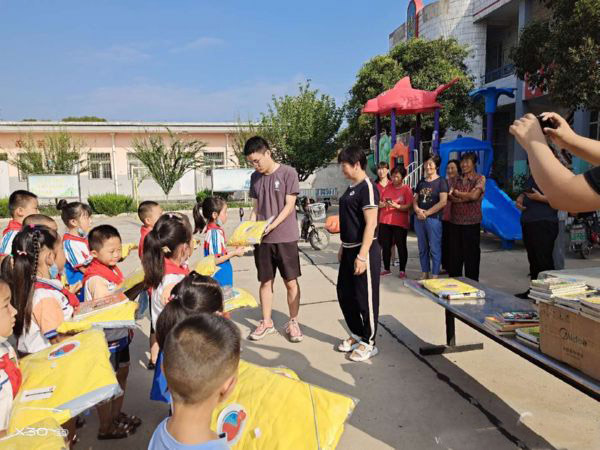 李智伟(右二)为杨蓬小学孩子发放爱心物品