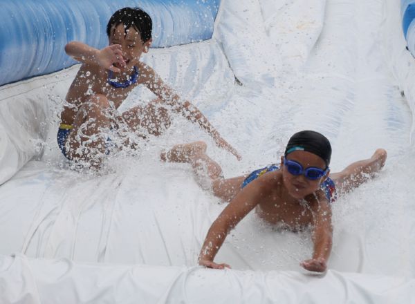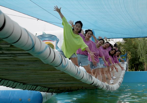 8月1日,游人在夏县小侯村绿康农业生态园的悠乐谷里休闲娱乐,尽享水的凉爽。