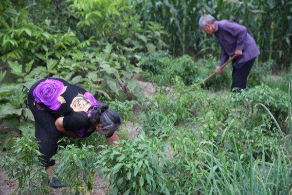 ▲8月4日傍晚,永济市城东街道办事处赵坊村,菜农王保全、谢任如夫妇冒着34℃的高温,给自家的菜田锄草。