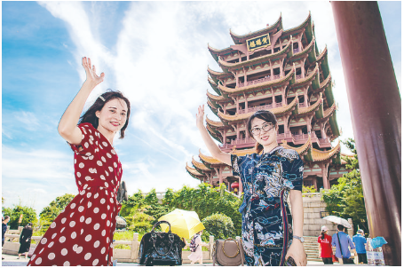 ▶8月7日,受邀来湖北旅游的海南支援湖北医疗队员陈小妹(左)与同事计超在黄鹤楼景区观光。 当日,受邀来湖北旅游的支援湖北医疗队员代表,在武汉市登上黄鹤楼参观。湖北省组织“与爱同行 惠游湖北”活动,陆续邀请支援湖北医护人员代表以及湖北医护人员、社区工作者、志愿者等走进景区,饱览荆楚风貌。