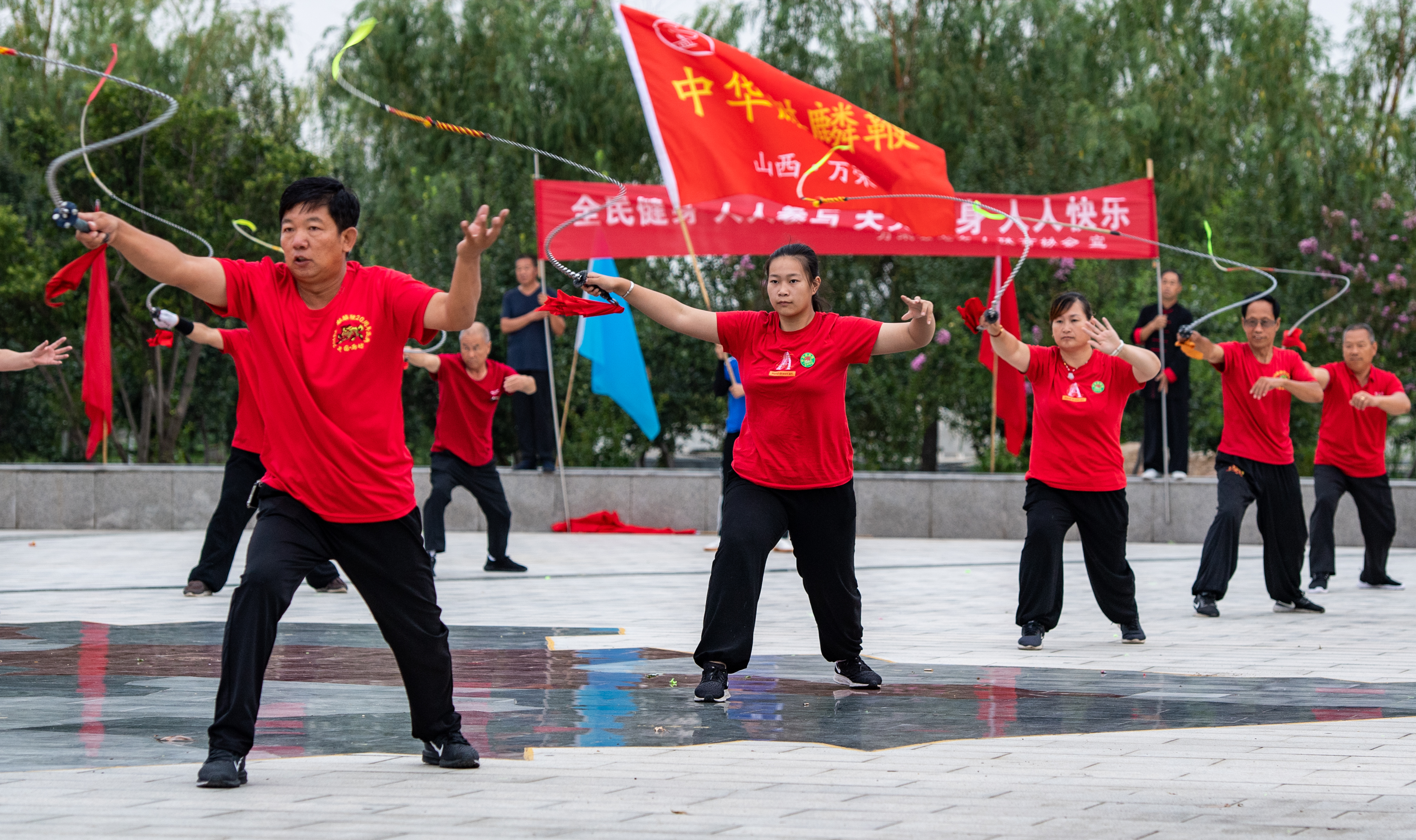 8月8日,万荣县老年体协开展“我健身 我快乐”活动,参与者表演了锣鼓、太极拳、中华麒麟鞭等节目。