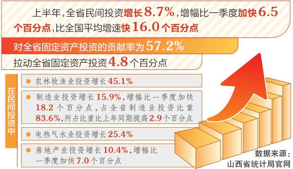 民营企业坚持转型为纲、项目为王,聚焦“新基建、新技术、新材料、新装备、新产品、新业态”,重点投向新兴产业、未来产业、高科技产业等领域,成为推动高质量转型发展的强劲动力。晋潞集团是我省规模产值最大的注塑企业,拥有近万台世界先进的注塑设备。今年,该集团将新增投资10亿元,启动二期项目建设,加快家电产品生产项目、改性塑胶原料生产项目及汽车配件生产项目投产。“新项目投产后,年产值有10亿元,还能带动注塑、电子元器件、包材、物流等上下游产业发展,为我省经济高质量发展作出新贡献。”集团负责人表示。从结构来看,我省民间投资中,重点领域得到进一步加强,农林牧渔业投资增长45.1%;制造业投资增长15.9%,增幅比一季度加快18.2个百分点,占全省制造业投资比重83.6%,所占比重比上年同期提高2.9个百分点;电热气水业投资增长25.4%;房地产业投资增长10.4%,增幅比一季度加快7.0个百分点。