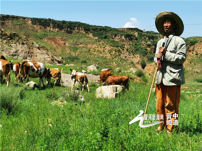 黄河新闻网晋中讯(记者李宏、边玲玉、程晓燕)蓝天、白云、高坡,牛群悠闲地啃食着青草,伴着牛铃叮叮铛铛的声音,戴着大草帽的放牛人万少华甩着牛鞭,且行且走,精力饱满地在田野下放牧。
