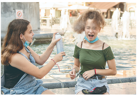 ◀8月9日,在法国北部城市里尔,一个女孩为同伴喷喷雾解暑。 法国各地近日被热浪席卷,包括巴黎省在内的多个省发布高温红色警报,法国气象局预计高温天气将至少持续到下周中期。 新华社发