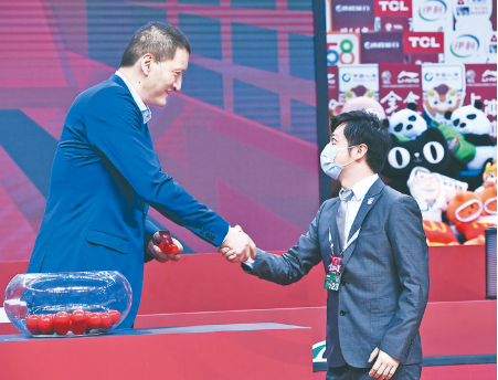 ▲8月10日,抽签嘉宾巴特尔(左)和获得第一顺位的上海久事队代表握手。 当日,2020年CBA选秀乐透抽签仪式在山东青岛举行。上海久事队获得第一顺位选秀权,时代中国广州队和天津先行者队分别获得第二和第三顺位。 新华社发