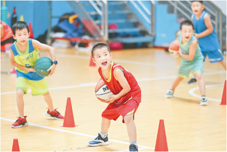 ◀8月10日,在贵州省铜仁市玉屏侗族自治县体育馆参加篮球训练营的小球员在进行训练。 暑假期间,许多学生通过参加球类运动的训练强身健体,感受运动的魅力。新华社发(胡攀学 摄)