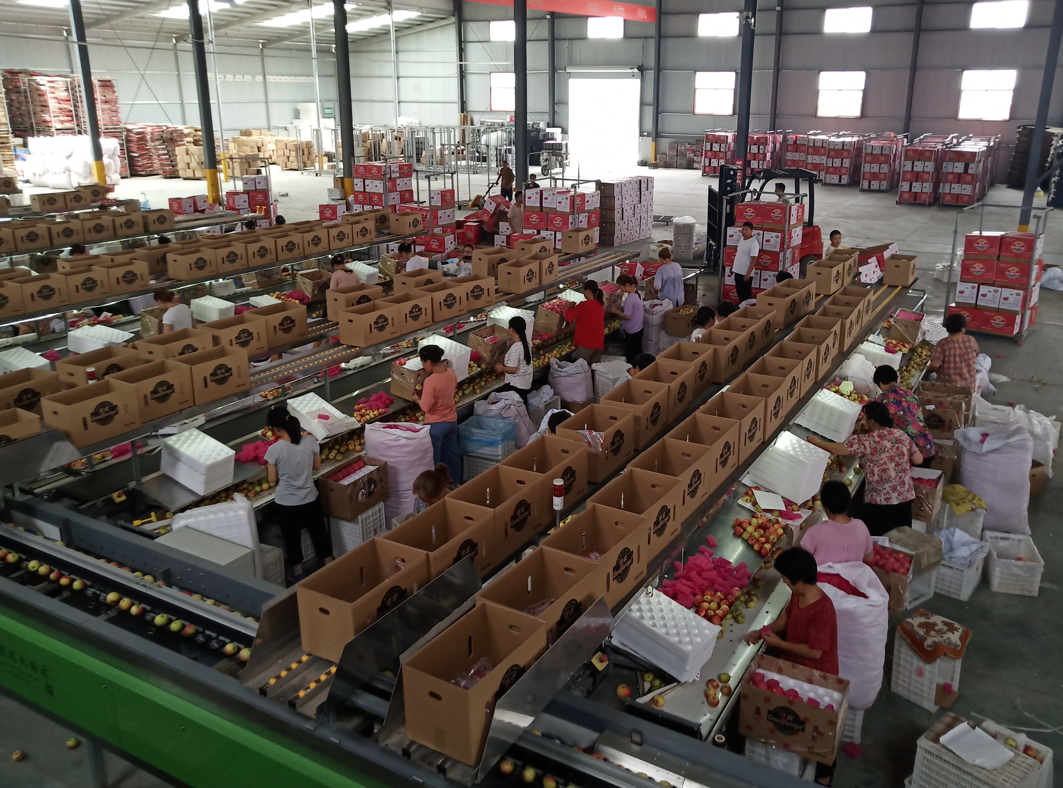 8月7日,在皓美公司的车间里,工人们在智能自动化分选生产线上忙碌着。清洗、烘干、选色、测病种、称重……一筐筐苹果经过分类、包装,不久将出口到印度尼西亚等国。
