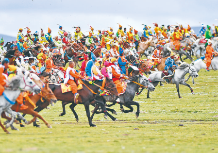 ◀8月14日,参赛选手驾驭赛马在传统大跑比赛中。 当日,来自西藏那曲市11个县区的184名当地少年骑手驾驭赛马,进行了全程8公里的传统大跑比赛。最终,来自那曲市色尼区14岁的小骑手索朗次巴驾驭赛马“琼拿”获得冠军。传统大跑比赛的结束,标志着为期5天的2020年那曲羌塘恰青格萨尔赛马艺术节落下了帷幕。 新华社记者 张汝锋 摄