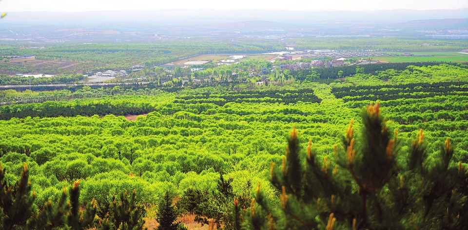 俯瞰之下,右玉县城置身于一片绿树环抱之中。本报记者阮洋摄