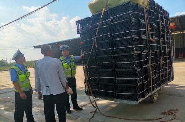 ▲8月13日,在临猗县三赵线路段,一辆电动三轮车运载的塑料果筐严重超出车身,非常危险。