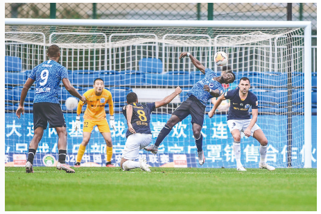 ▶8月16日,大连人队球员博阿滕(右二)在比赛中争顶。 当日,在2020赛季中国足球协会超级联赛第一阶段(大连赛区)第五轮比赛中,广州富力队以1比0战胜大连人队。 新华社记者