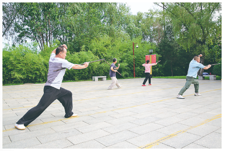 ▲8月13日上午,在永济市柳园,几名常年坚持健身的市民,在演练形意鞭杆。 立秋以来,天气转凉,出来锻炼身体的人也逐渐多了起来。在永济市,居民们利用早晚时间,到公园、小区广场或小游园,跑步、打篮球、跳广场舞等,通过各种方式锻炼身体。 特约摄影 薛启涛