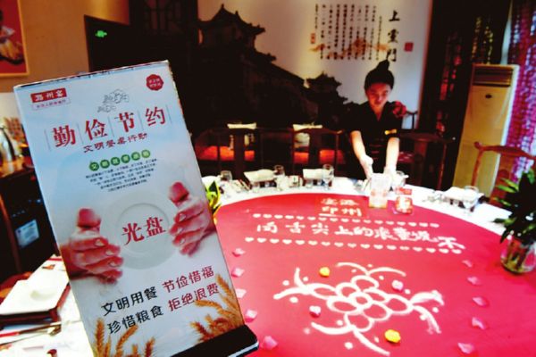 ▲8月13日,在长治潞州宴餐饮企业,工作人员在餐桌上放置“光盘行动”桌牌。当日,长治潞州宴餐饮企业开展“‘光盘行动’拒绝餐饮浪费”宣传活动,通过店内海报、视频、服务人员提示等多种形式,号召消费者用实际行动加入到“光盘行动”中,让节约粮食、文明用餐成为人人遵守的好习惯。 (《山西日报》8.15)
