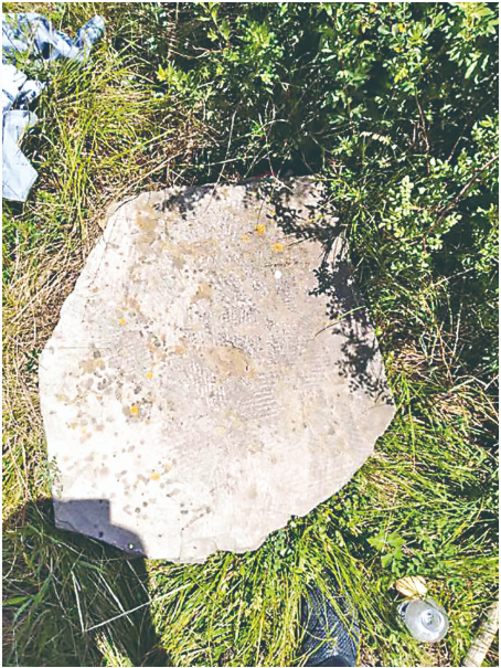 石刻外形概况:因其放置在峰上,只能大概观之,长约80厘米,宽约60厘米,厚约10厘米,重约100公斤,呈不规则五边形。