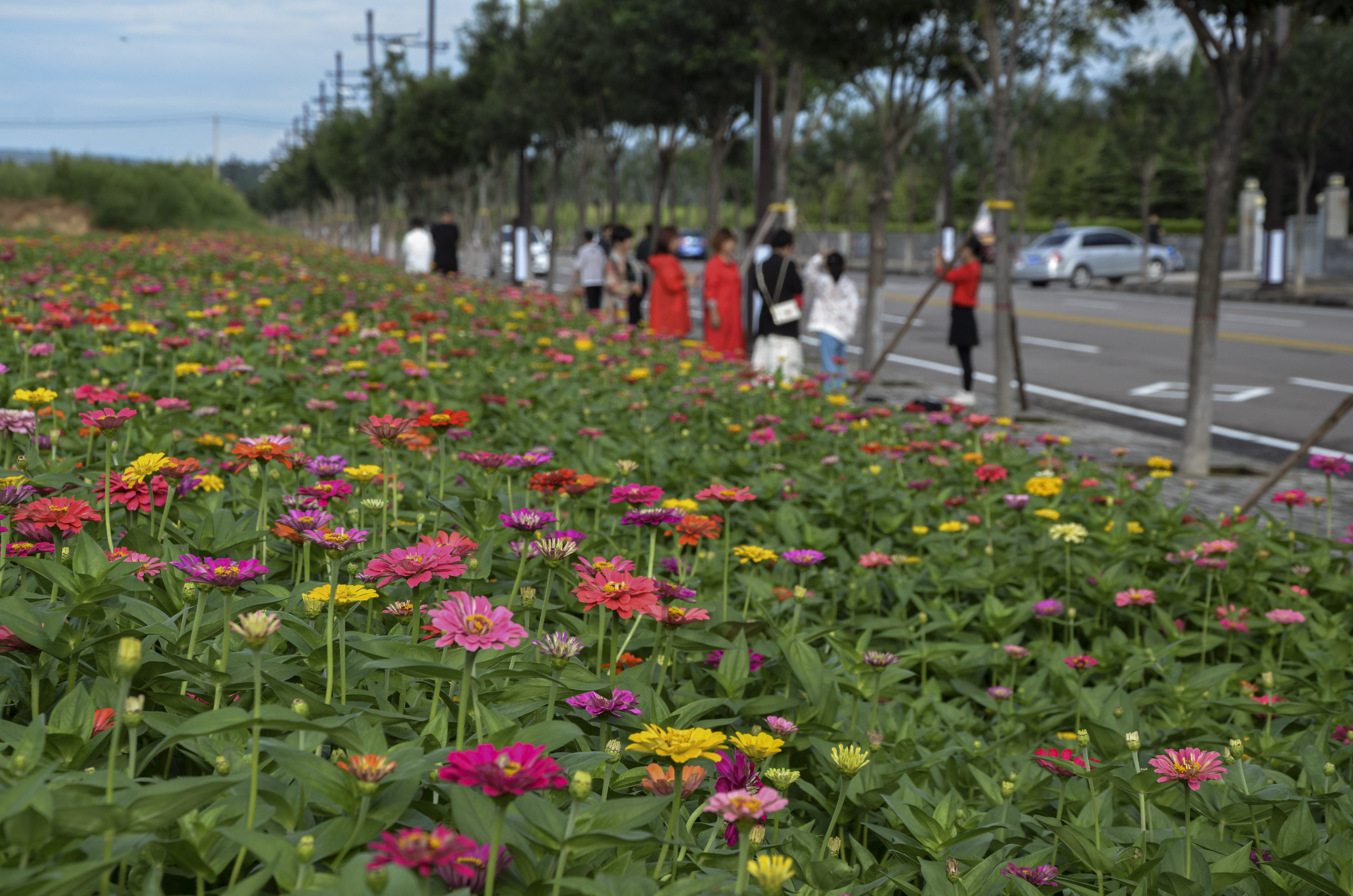 8月19日,万荣县居民在华康北路街道洋菊花旁拍照留念。 位于华康北路的洋菊花占地20余亩。眼下,正是洋菊花盛开的时节,该县县城及周边的居民纷纷前来观光赏花、拍照留念。特约摄影 解建国