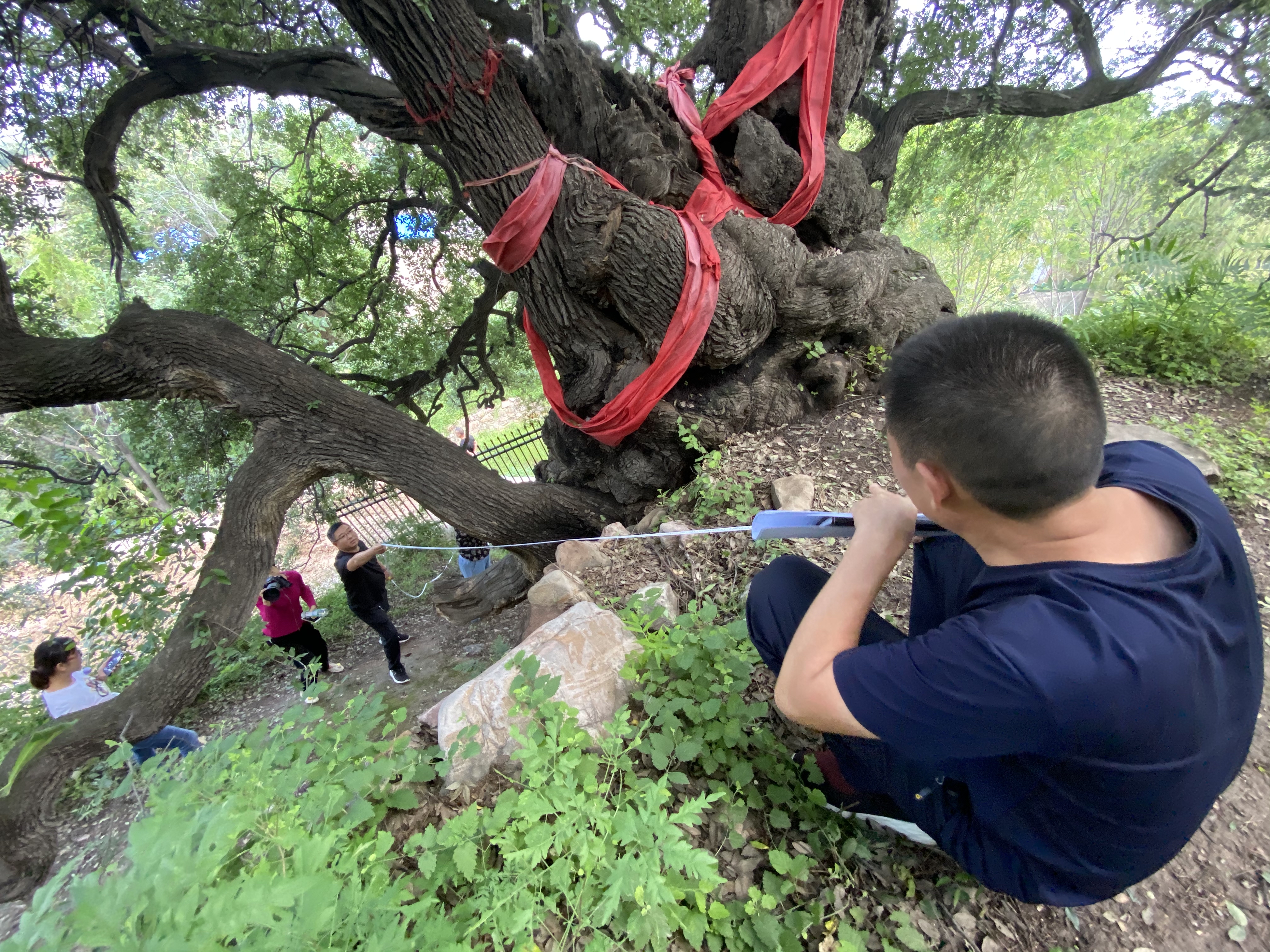 考察组在对永济市虞乡镇张家窑村一株古橡树进行测量 刘凯华 摄