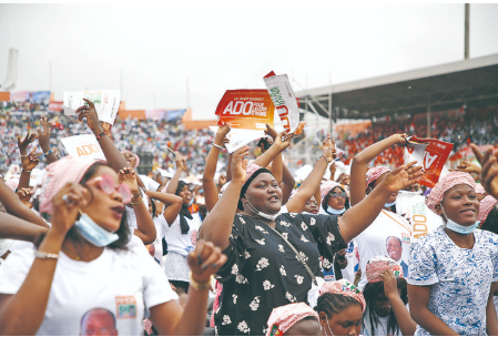 ▲8月22日,科特迪瓦总统瓦塔拉的支持者在阿比让参加活动。 科特迪瓦总统瓦塔拉22日在科经济首都阿比让正式宣布,将代表执政党参加定于10月底举行的2020年总统选举。新华社发(伊万·宋 摄)