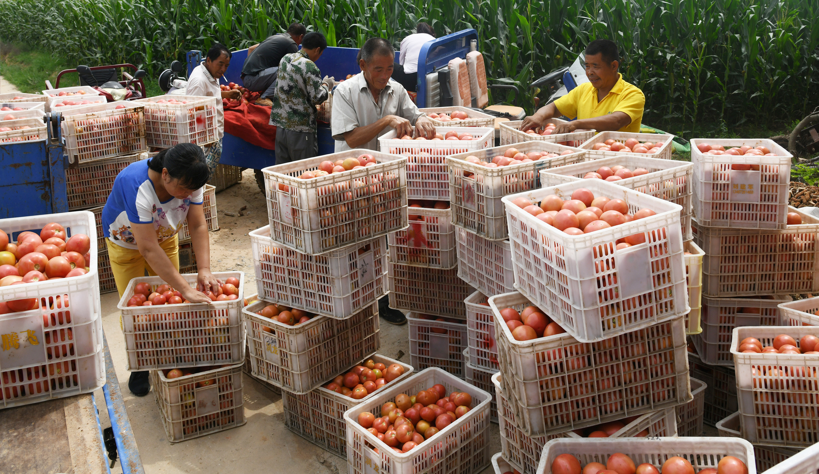 8月20日,闻喜县后宫乡三河口村村民将采摘的西红柿挑选装箱,准备发往外地市场。
